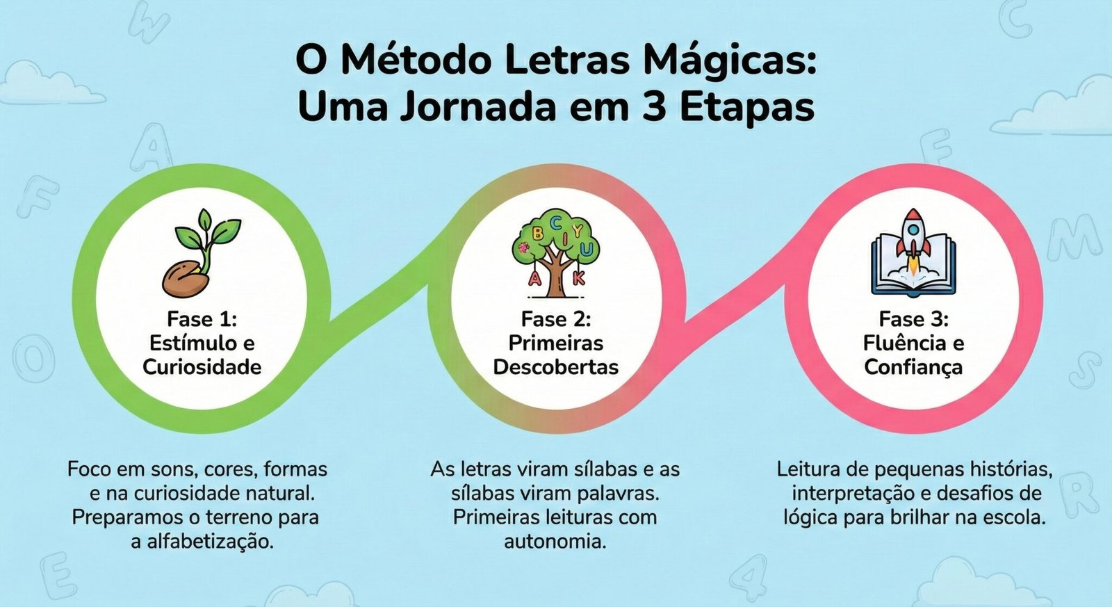 O foco principal do Clubinho Letras é o desenvolvimento de crianças entre 3 e 8 anos, cobrindo desde o primeiro contato com as letras até a fluência na leitura.